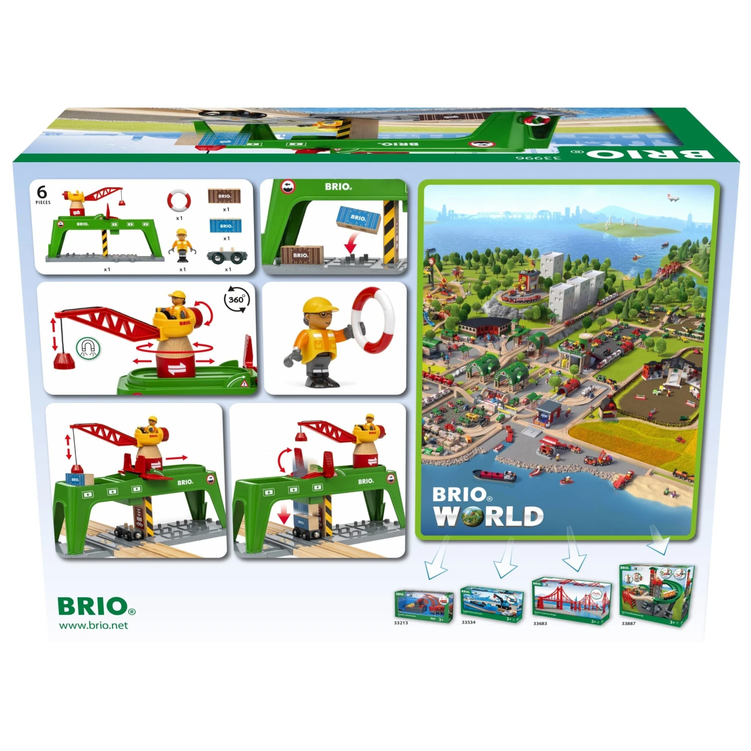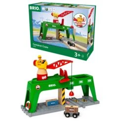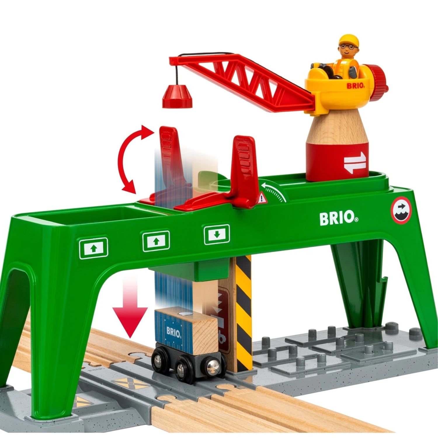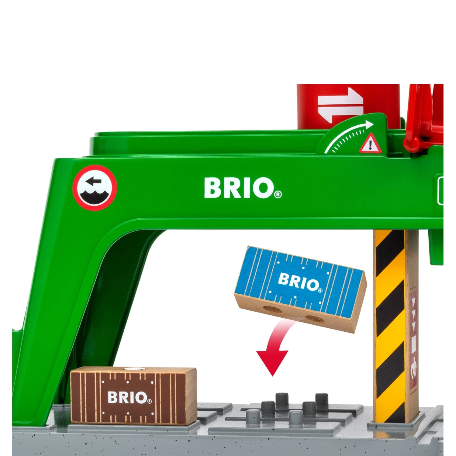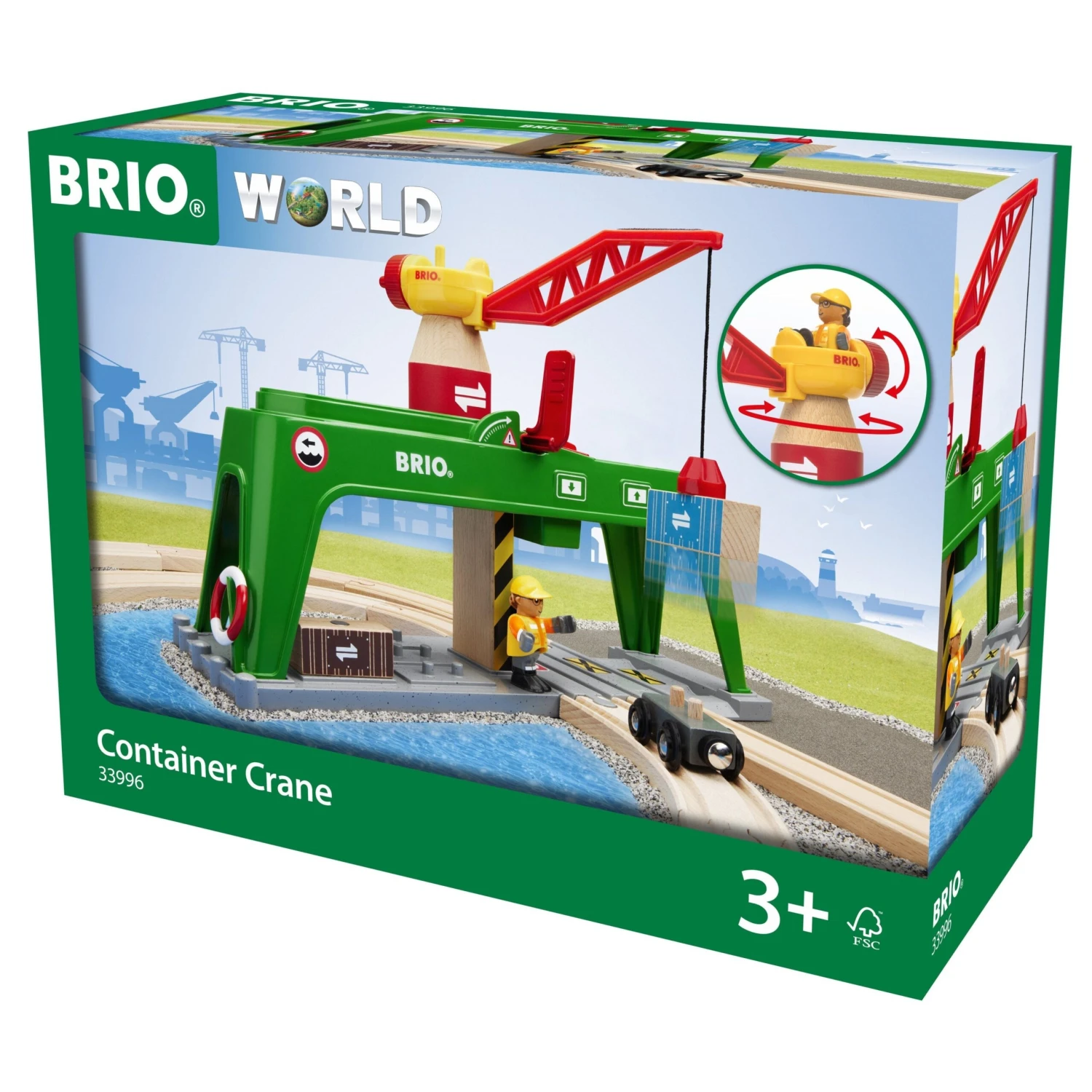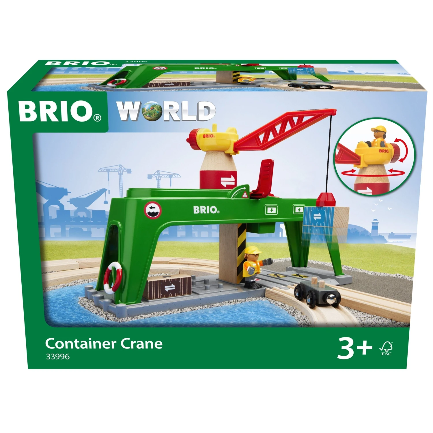 Managing all the heavy shipping containers at the BRIO World dock is no problem with the 33996 Container Crane. Take a seat on top of this big, green, railway accessory and get to work. 360˚ crane action: Grab one of the containers with the magnetic hook, then rotate and slide the large crane into position above the tracks. “Left a little, right a little. Perfect!”. Lower the wooden cargo into place using the winch and lock it in with the red lid before it drops perfectly onto the awaiting wagon below. The construction play of this familiar container crane helps children’s development by promoting logical thinking in a recognizable scenario, whilst intricate details such as cranks and switches helps to train fine motor skills.