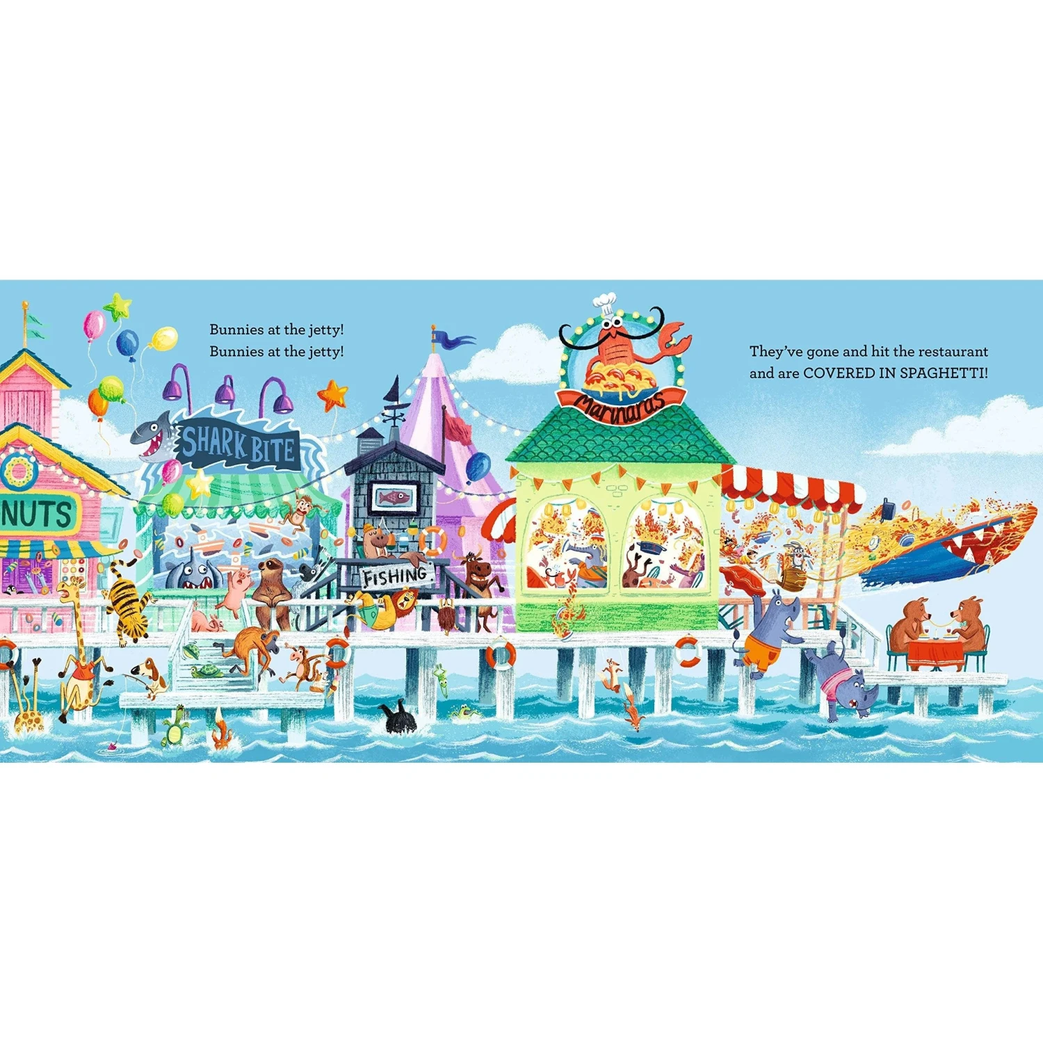 The bunnies are back! And this time, they’ve commandeered a BOAT! Watch out, Sunnytown beach, the Bunnies are dashing and a-splashing on a speedboat frenzy. They whoosh past the sail-boats, and zoooom across the sand, then it’s up on to the jetty where silly billy Bunnies get all covered in spaghetti! But watch out, oh no, where are the bunnies off to now? To the airport, across the tarmac … it’s bunnies on the PLANE. Here we go again…