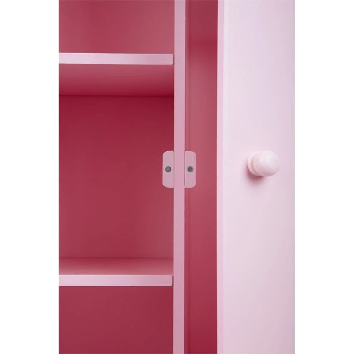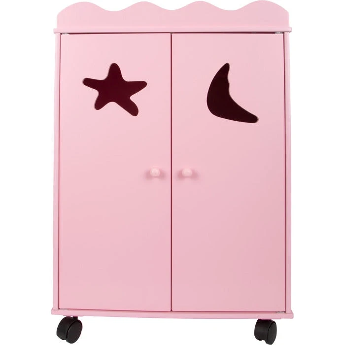 A great varnished wardrobe on wheels for the doll’s dresses. The doors are decorated with moon and star motifs. The wardrobe has a sensible arrangement with two shelves on the left side and one clothes rail on the right side. Plenty of space for all the dolls’ clothes.