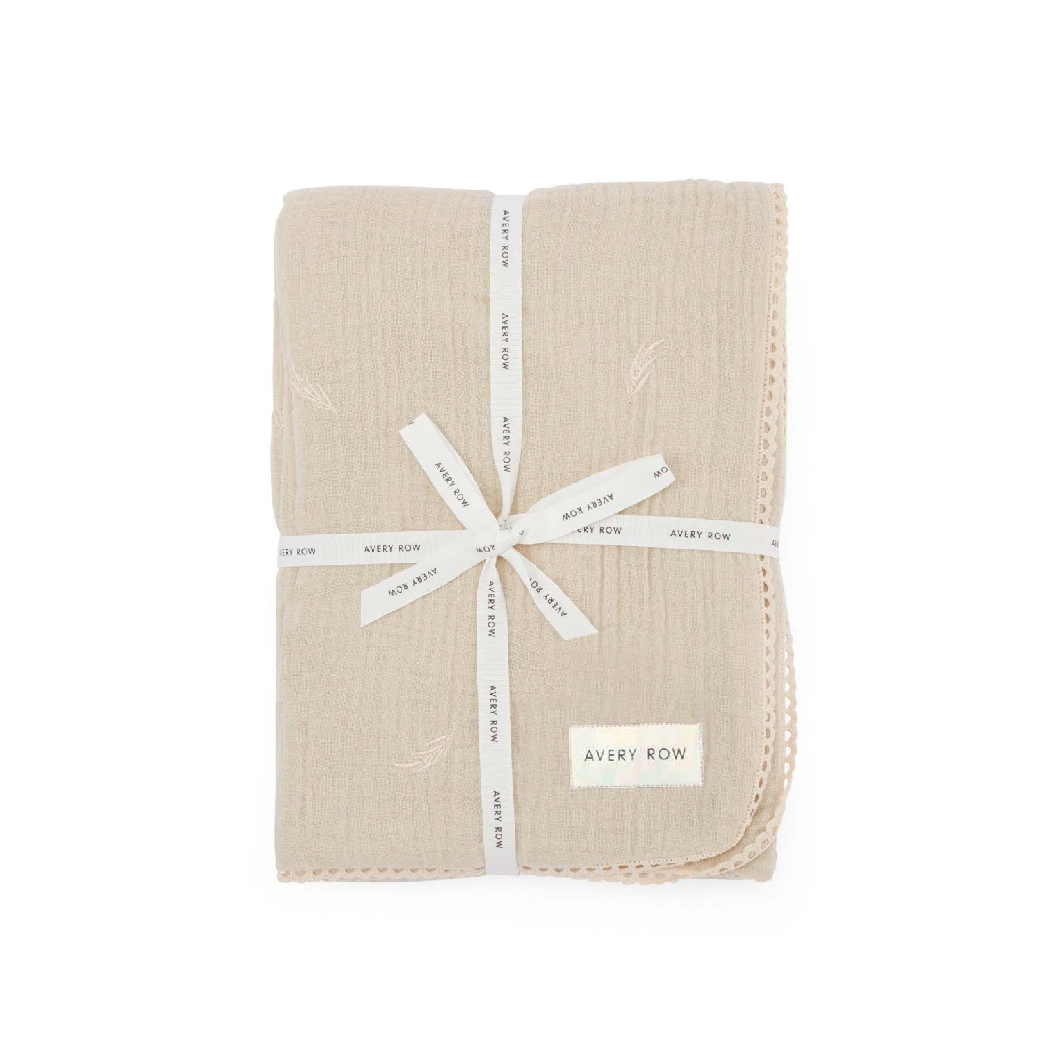 Introducing our new 4-layer muslin blanket. Embroidered on one side with a beautiful grass motif and finished with a delicate lace trim, this lightweight and breathable blanket is perfect for your little one, and makes a lovely gift.