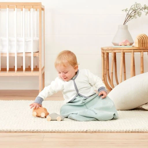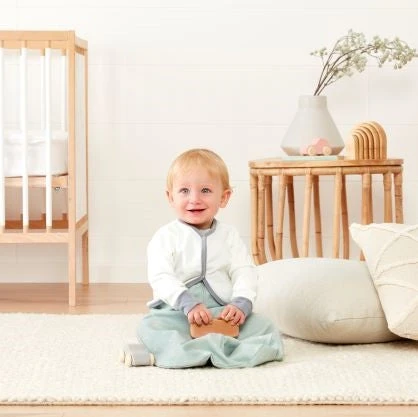 Our Arm Warmers are a bolero style jacket, designed to be used over the top of any arms-out sleeping Swaddle, Sleeping Bag, Sleep Suit or Sleep Onesie. If your baby is wearing a sleeveless sleeping bag, you may notice their arms feeling cool during the coldest hours of the night. If this is causing them to wake, a little more warmth on the arms may be needed. The sleeves on the Arm Warmers are rated 1.0 TOG making them suitable as a mid-weight layer, and the fold over cuffs will help keep hands warm too. We recommend the Arm Warmers are only used over a sleeveless sleeping bag, not one with sleeves. This will help your child maintain a comfortable temperature whilst sleeping and ensure they do not overheat. Hot tip – on Tran seasonal nights when it is warm at bed time but cools down during the course of the night, put your baby to sleep in their sleeping bag as normal, and add the Arm Warmers later in the evening before you go to bed. The position of the Arm Warmers on the body will not interrupt the natural sleeping position for healthy hip joint development. Made with our signature premium GOTS certified organic jersey cotton with stretch for comfort. Natural fibres are better for sleeping for the simple reason they are breathable, and help your little one regulate their temperature overnight. Our certified organic fibres are also skin-friendly and sensitive on eczema and dry skin conditions.