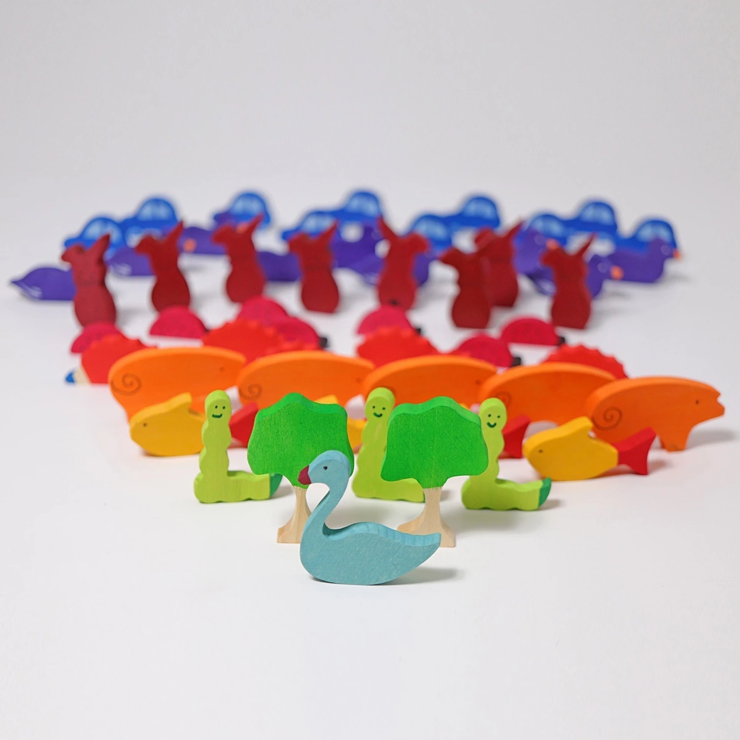55 hand-painted figures: 1 swan, 2 trees, 3 caterpillars, 4 fish, 5 pigs, 6 hedgehogs, 7 ladybugs, 8 rabbits, 9 ducks and 10 cars. With game ideas.