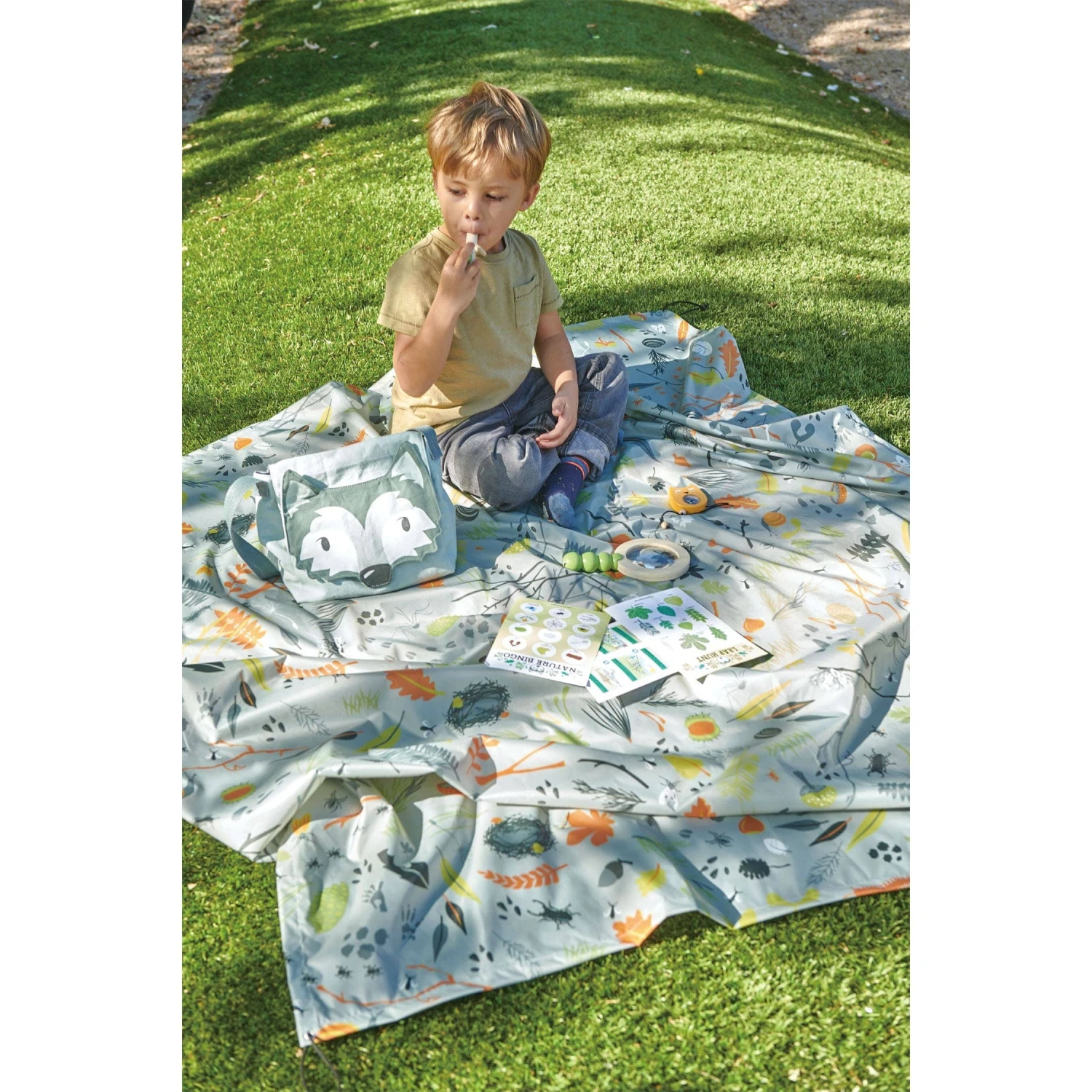 If you go down to the woods today, you will want to take with you this wild wolf bag and nature trail whistle and super waterproof groundsheet! The groundsheet is illustrated with lots of forest floor treasures and is enormous at 142cms x 142cms. There is a big magnifying glass to search for mini beasts and a printed nature trail card to help you find all the wonderful life in the forest.