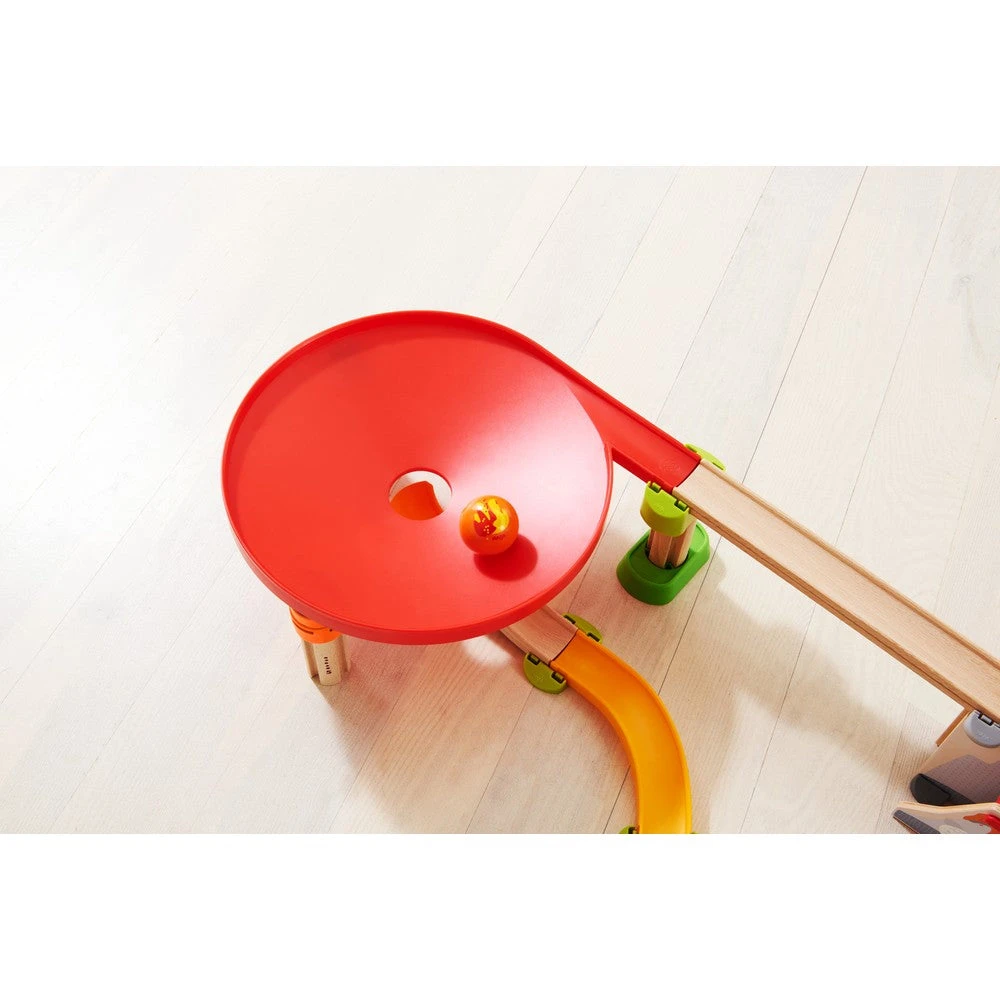 1 dragon volcano, 1 dragon tunnel, 1 ball funnel, 4 curves, 3 straight tracks, 1 wavy curve, 1 ramp, 1 starting ramp, 3 columns, 12 connecting elements, 1 backdrop clamp, 1 dragon ball, 1 lava ball, 1 dino egg ball.
