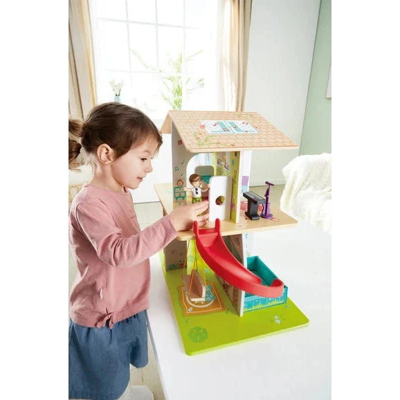 This toy house is packed full of 8 different adventurous rooms with 9 exciting sound effects for hours of play. Children can hear the keyboard and guitar playing and pretend to be a rockstar in the concert room, listen to a movie sound clip in the television room, or even slide down the curved slide to the pool in the beach room. Kids can also hear a hairdryer, toilet flushing in the bathroom, a lullaby clip and clock ticking in the bedroom.