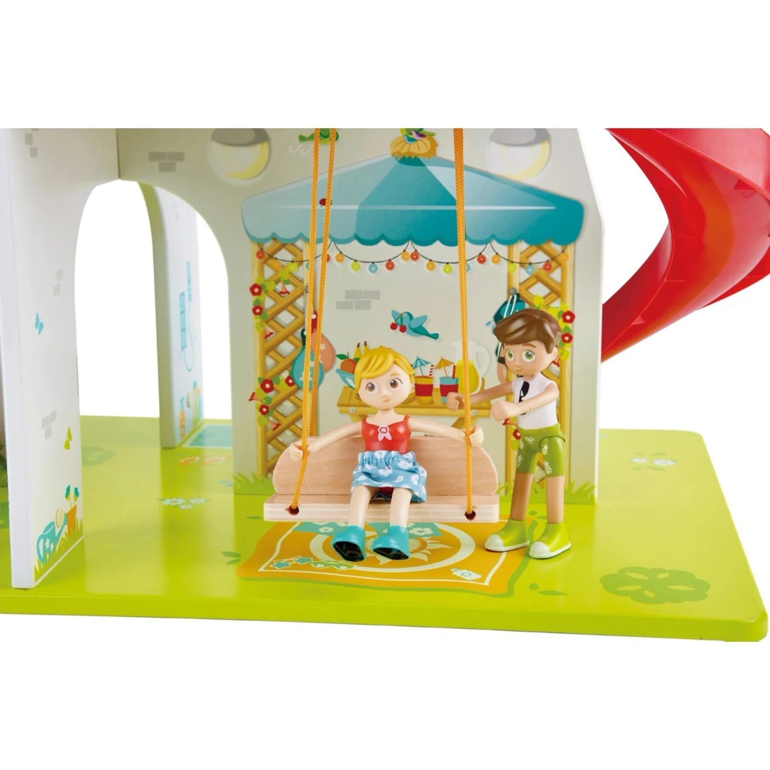 - Accessories include a piano, guitar, microphone, sofa, green plant, table, two chairs, two dishes and cups, a pan, two fish skewers, toilet, bathtub, bunkbed, pet slide, animal house, pool, big slide, stairs, swing, dog, cat, posable girl figure and one posable boy figure