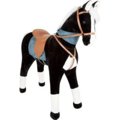Galloping away to the next adventure! This black riding horse with its cushioned, removable saddle and the cute, knotted handkerchief will enchant every young horseback rider immediately. By pressing on its ear, it makes a happy whinnying sound. This plush riding horse is a great role-playing companion for children in the chldren room! Batteries not included. With its 75 cm seat and a maximum carrying capacity of 80 kg, this riding horse is a wonderful enrichment for the children room and a real must-have product.