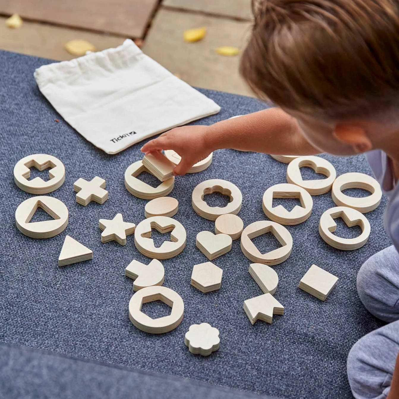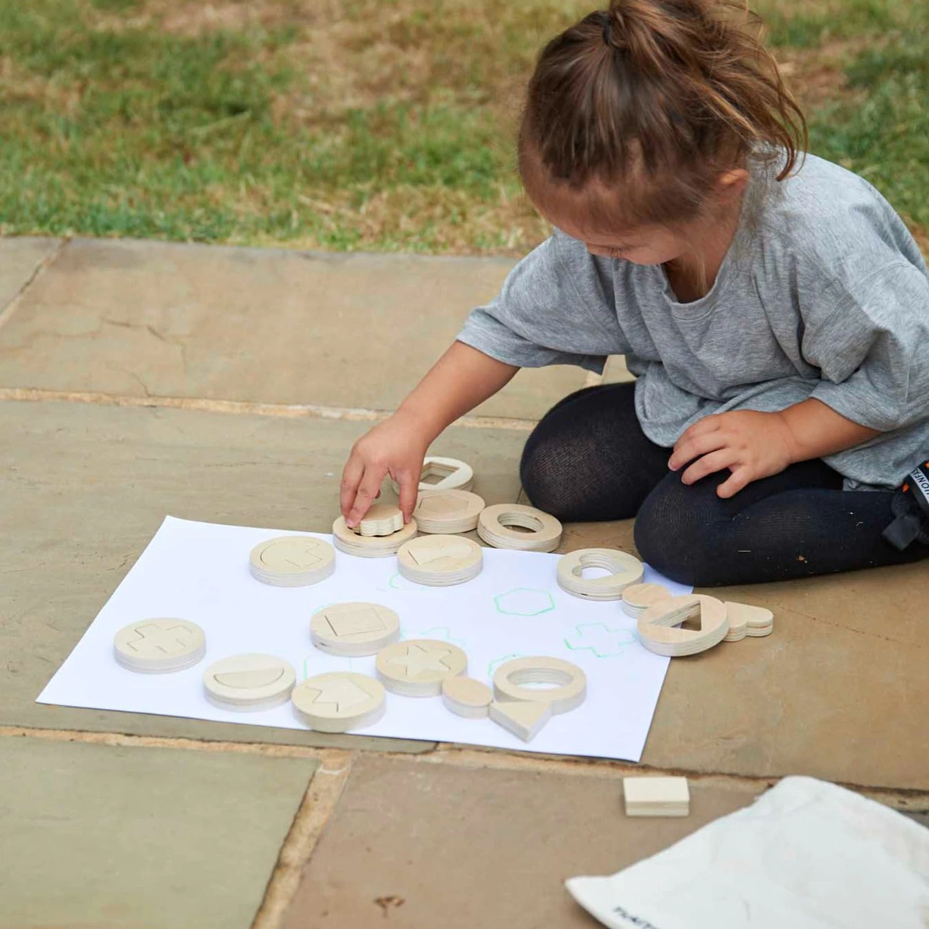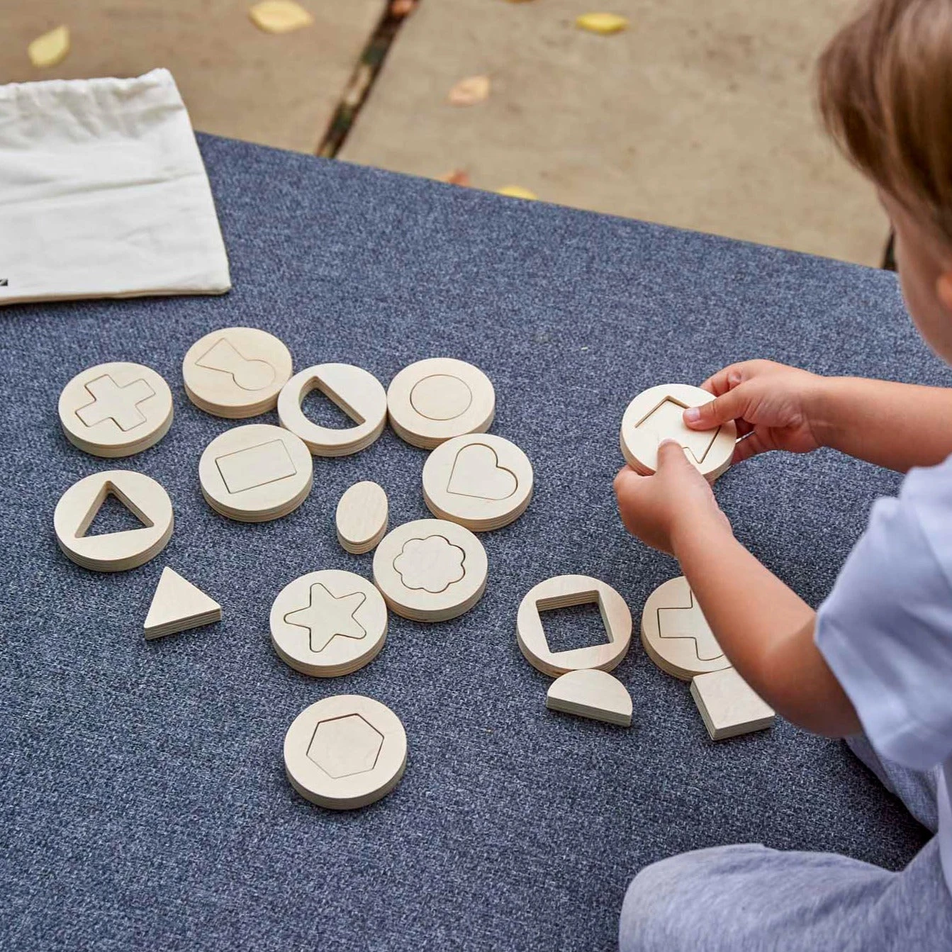 Set includes: 14 shapes and 14 discs made from birch plywood, in a cotton drawstring storage bag with an activity guide in 8 languages.