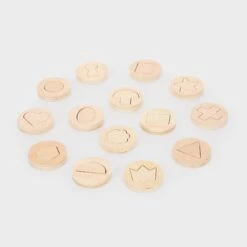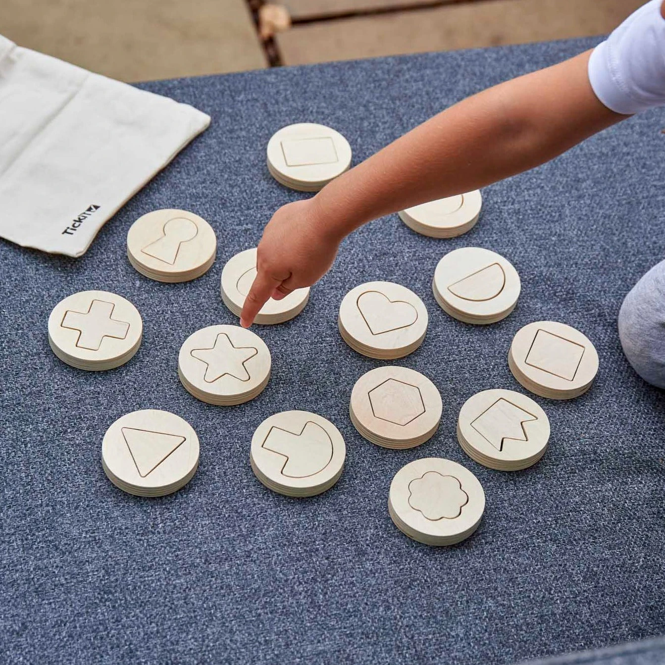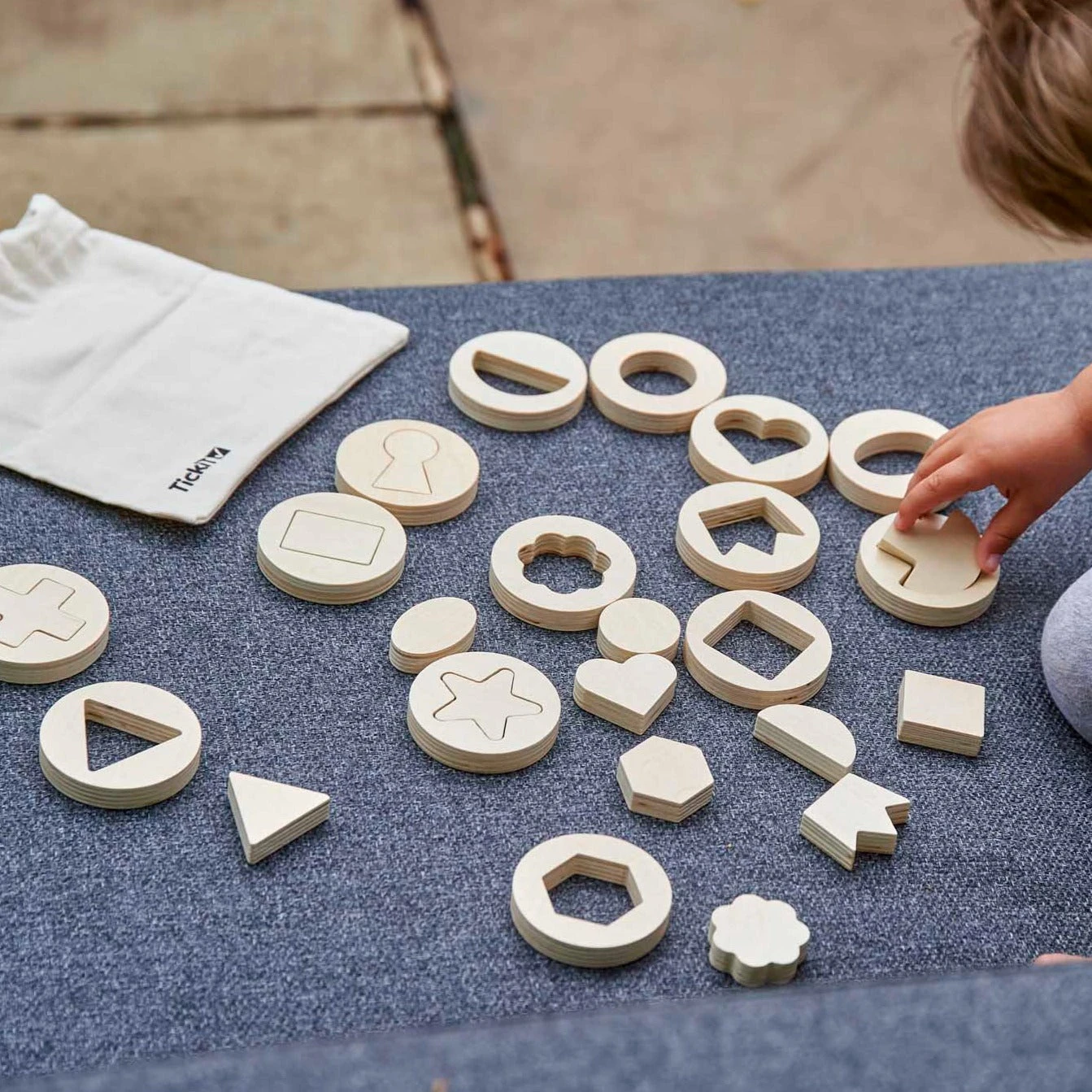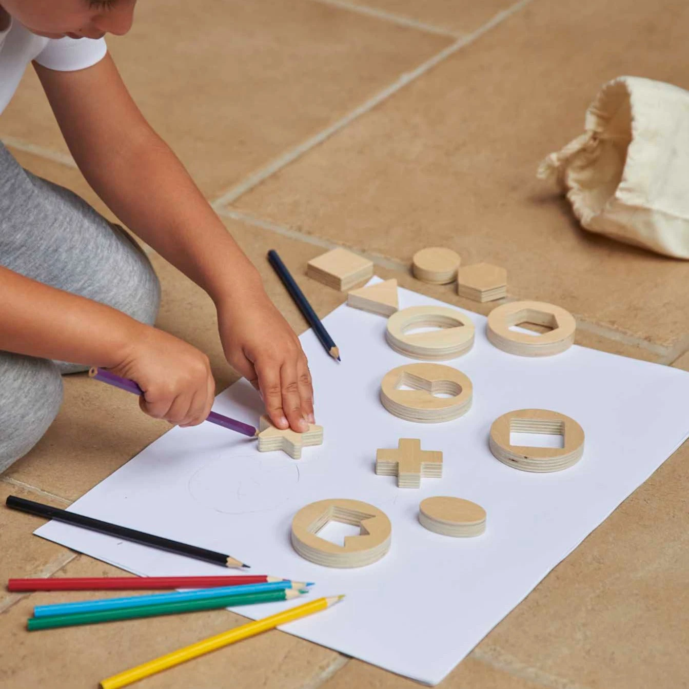 Set includes: 14 shapes and 14 discs made from birch plywood, in a cotton drawstring storage bag with an activity guide in 8 languages.