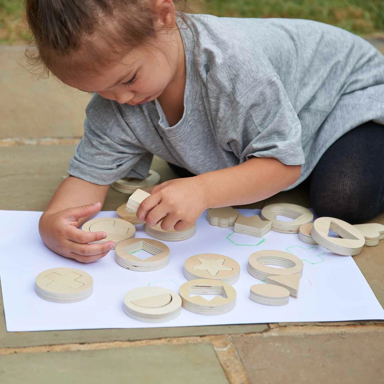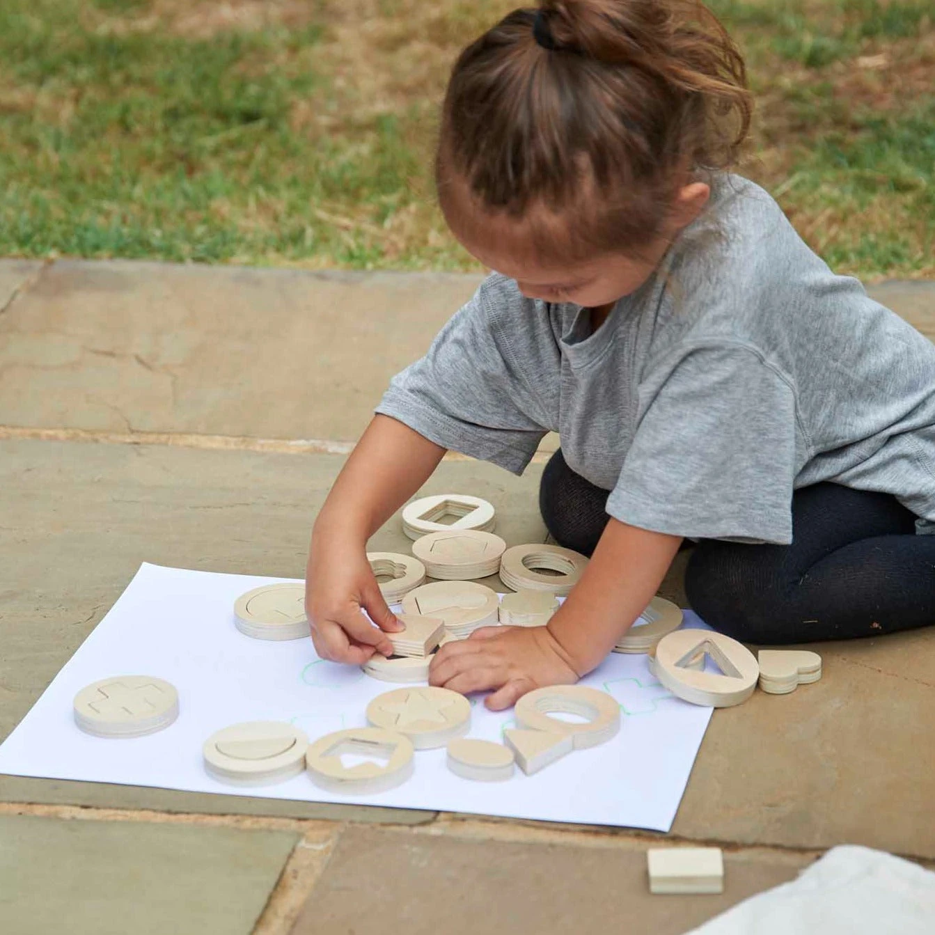 Let your little one’s creativity soar with TickiT® Inside Outside Wooden Shapes! Explore shapes and puzzling with 14 wooden discs that have different shapes nested inside, perfect for tracing, drawing, and pattern making. These 1.2cm thick, smooth and tactile pieces are great for small hands to manipulate. Your kid will have endless fun with this set!