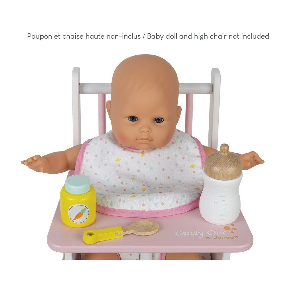 The set includes 8 accessories. This white baby-changing bag with its delicate prints is suitable for dolls from 36 to 42 cm. Wooden accessories are ®-certified (made using wood from sustainably managed forests).