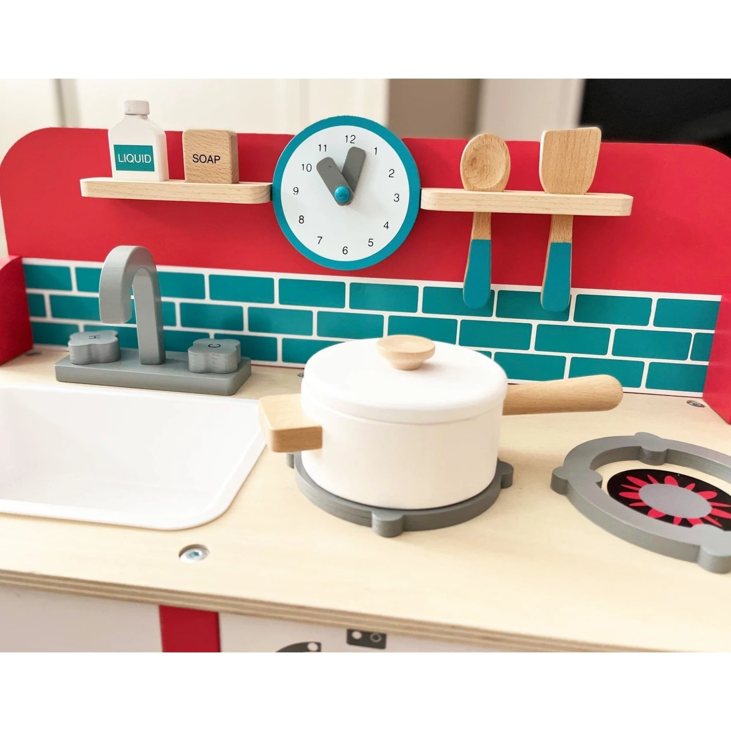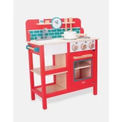 Featuring a retro design, the Kingsley Kitchen is crafted with innovative plywood and strong beech wood for superior stability and sturdiness. The kitchen set comes with a clock with moving hands, shelf, spatula, spoon, pan with lid, washing liquid and bar of soap, and is ideal for imaginary or role play activities. Unlike other, less expensive options, this kitchen set is free of MDF.