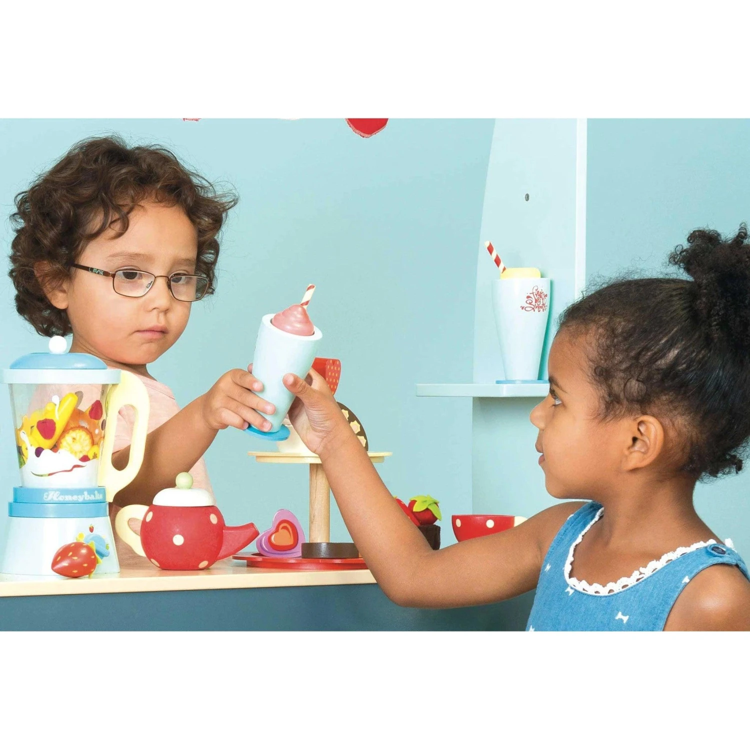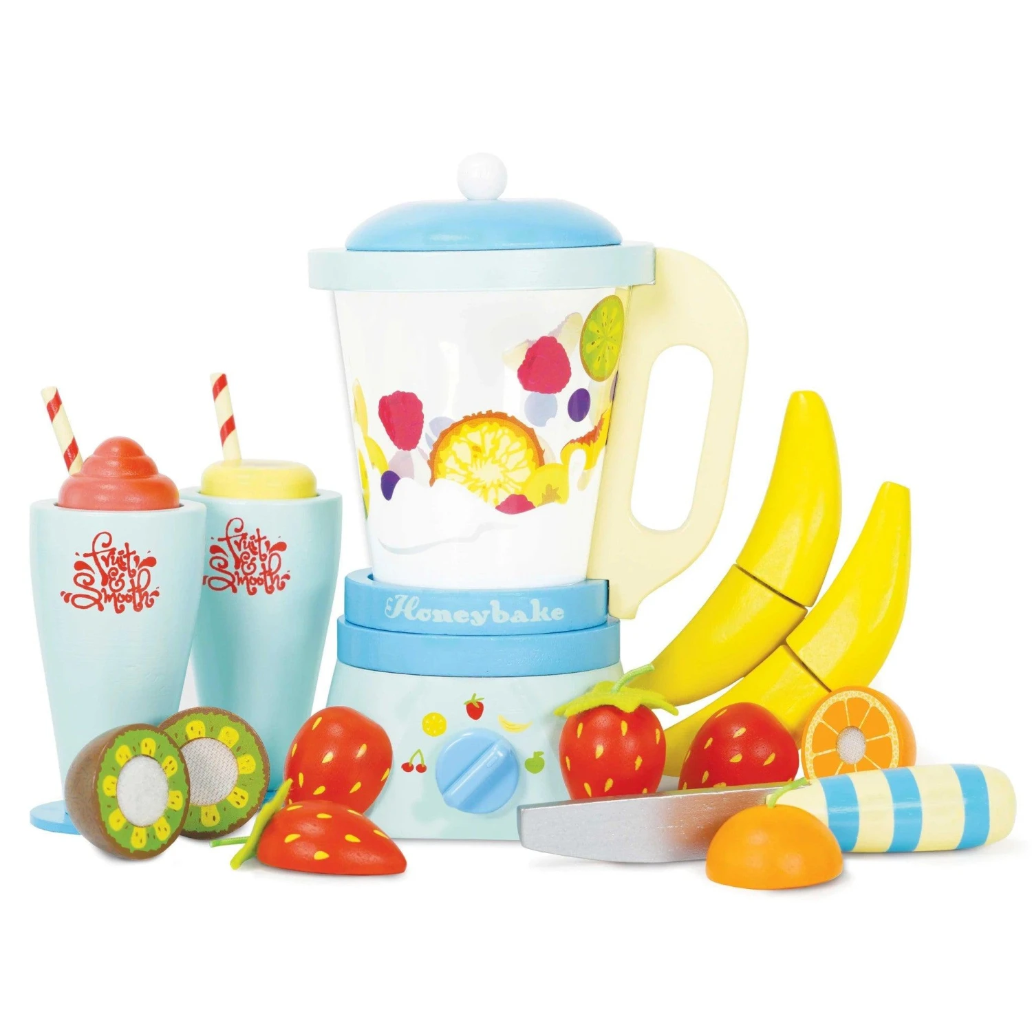 Featuring a retro style blender with a detachable jug, 6 sliceable fruits, a play knife and 2 wooden tumblers with removable toppings.