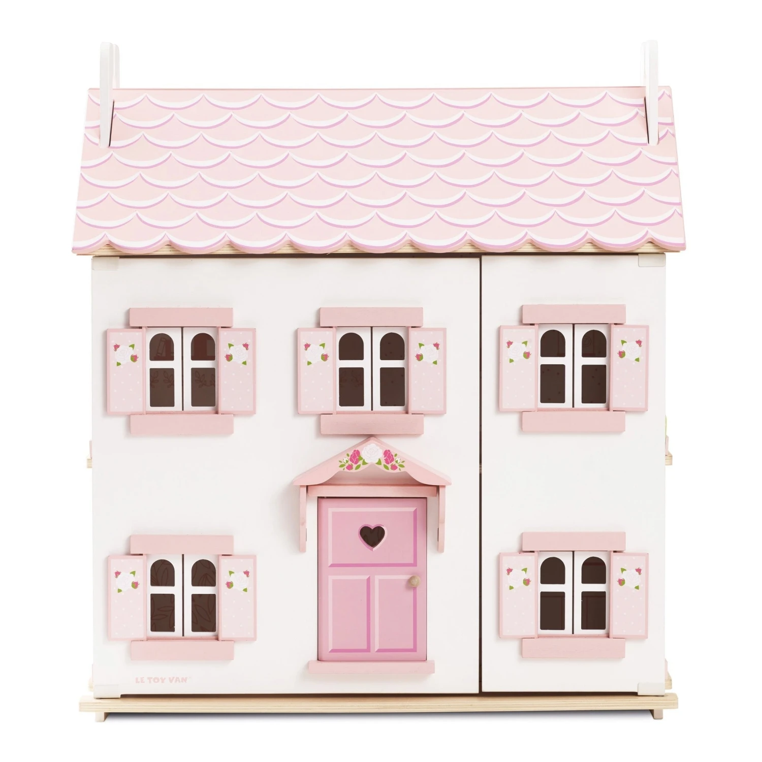 Full of nostalgic charm, this wonderful doll house is painted in the prettiest pastel pink and fresh whites, with opening and closing windows and shutters, each featuring a floral motif. The cute front porch makes a welcoming entrance for little guests.