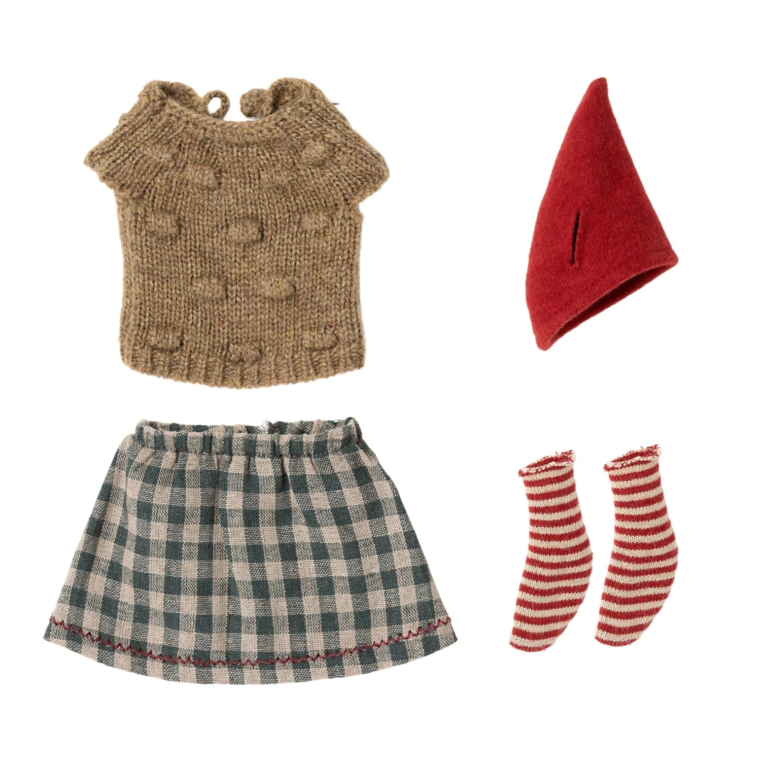 Everybody needs a new set of clothes to celebrate the wonderful days of Christmas. This set of christmas clothes will fit any Maileg medium mouse.