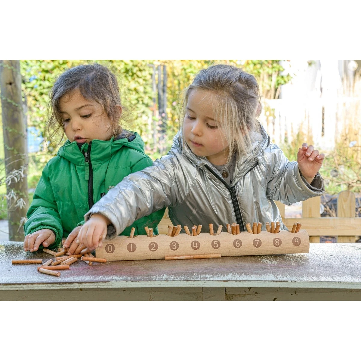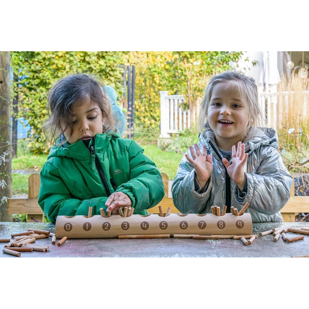 Each side of the log shows a slightly different range of numerals (1–10 on one side and 0–9 on the other), making it helpful to teach number order and the value of zero.