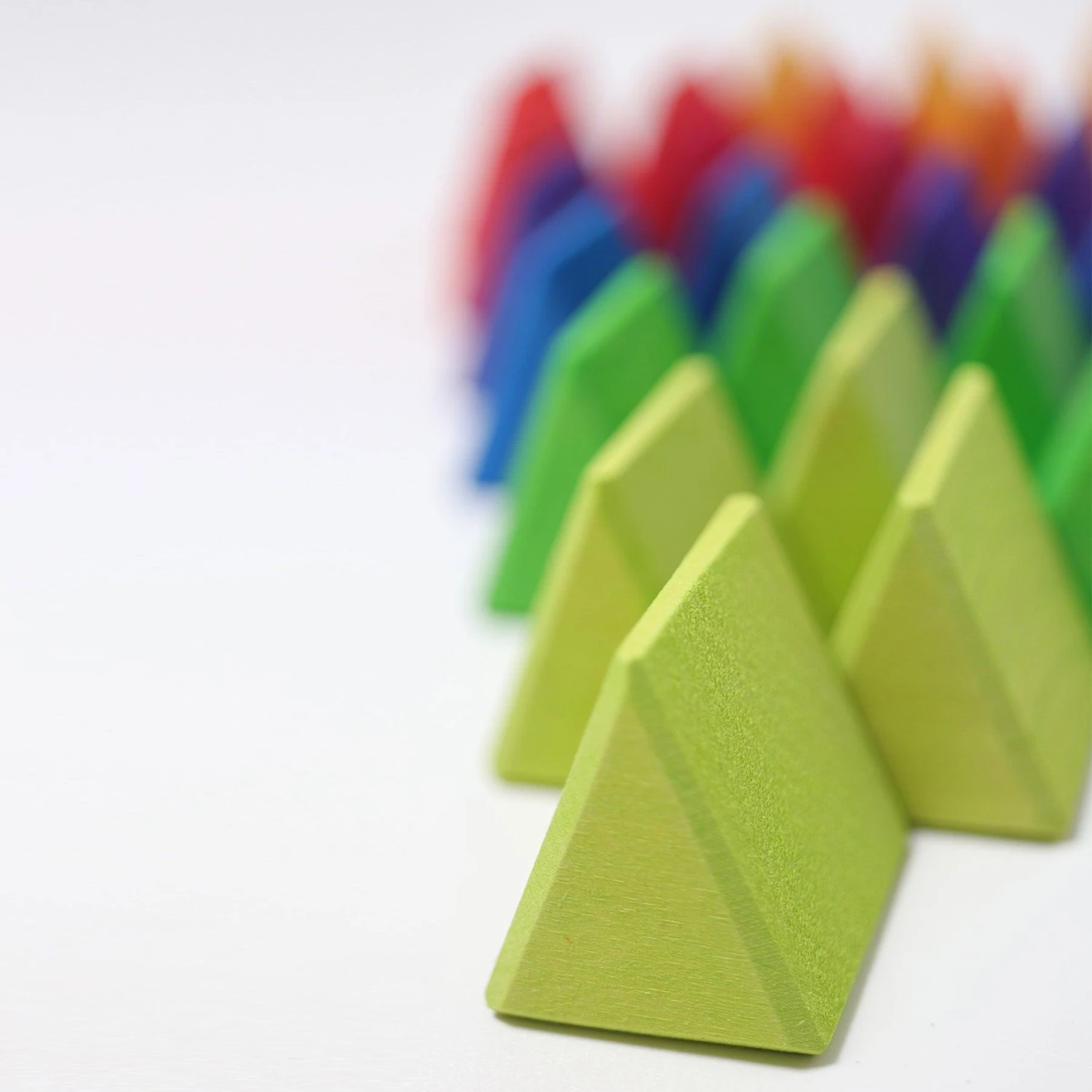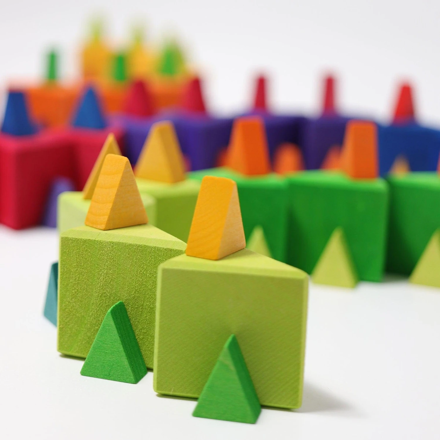 What is the finish or coating on the blocks? An outstanding and unique characteristic of all our building blocks is the velvety surface which arises because we use colour glaze that penetrates into the wood, leaving a matte finish rather than a glossy one. The individual pieces are dipped by hand into the stain and we intentionally do not put a final protective coating on it to preserve the positive characteristics of the wood. Our way of making blocks guarantees that they stack more easily with greater play possibilities. Children feel and experience the wood fibres and structure while playing.