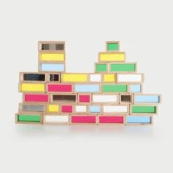 Set includes: 36 wooden bricks (24 large, 12 small) with safe rounded corners and colourful inserts in 6 different colours (red, green, blue, yellow, clear and mirror).