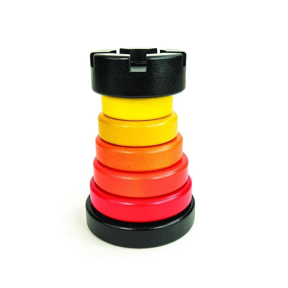 Wooden stacking board on rotating wheels, with string to pull includes 1 base with numbers 1-5 and 15 circular blocks in natural colour