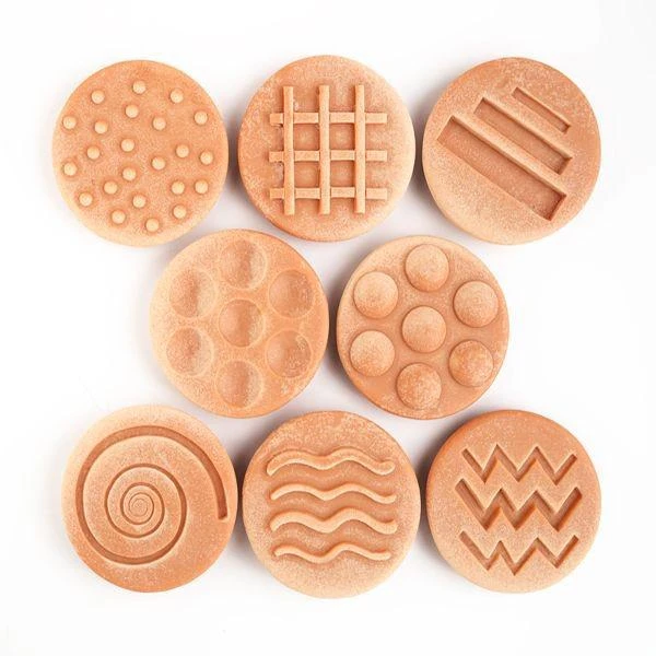 Each stone in this set of eight measures 75mm and include four raised/bumpy designs (circles, dots, wavy lines, and a grid) and four indented/hollow designs (circles, lines, zigzags, and a spiral). Age 18mths+.