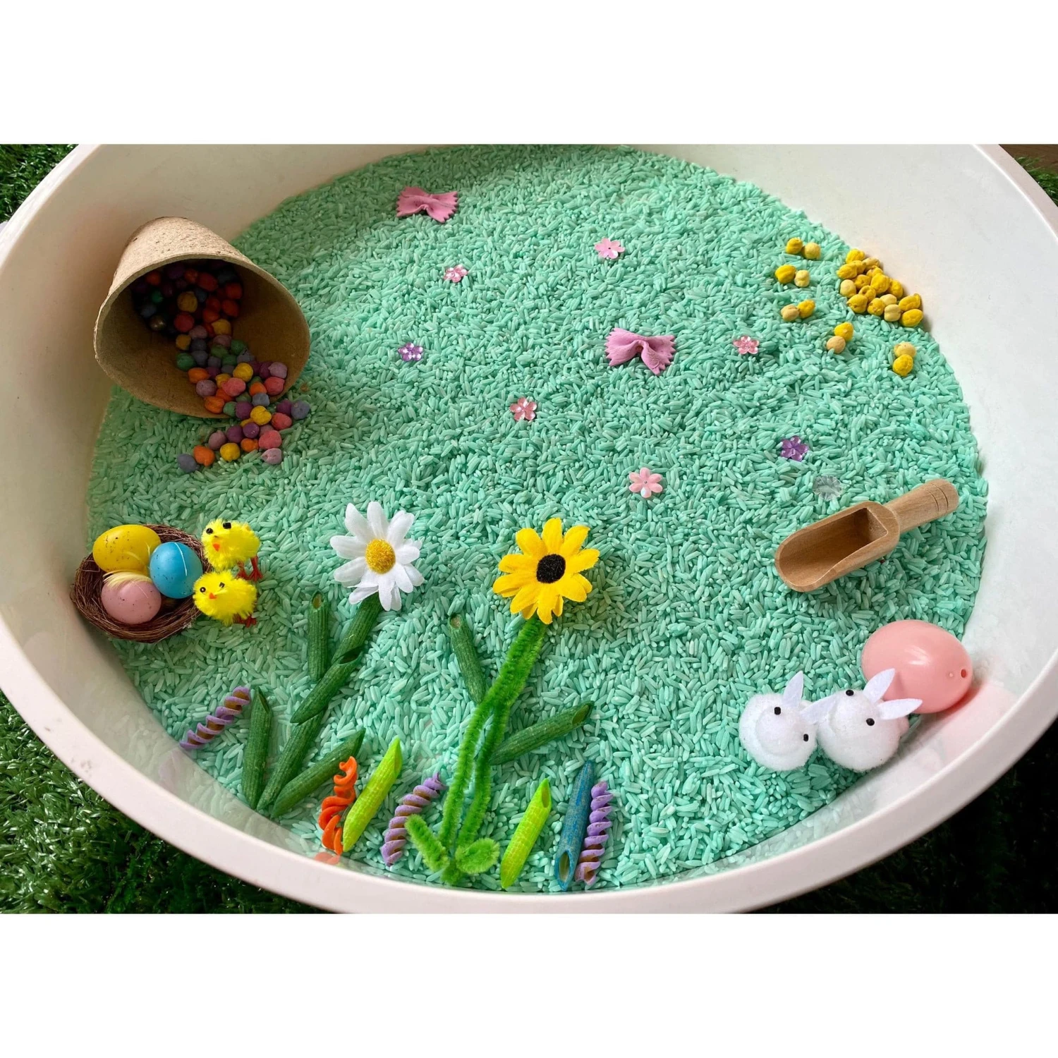 Create the flowers with the pasta shapes, scoop, tip and pour the rice. Also encourage discussion about spring during play.