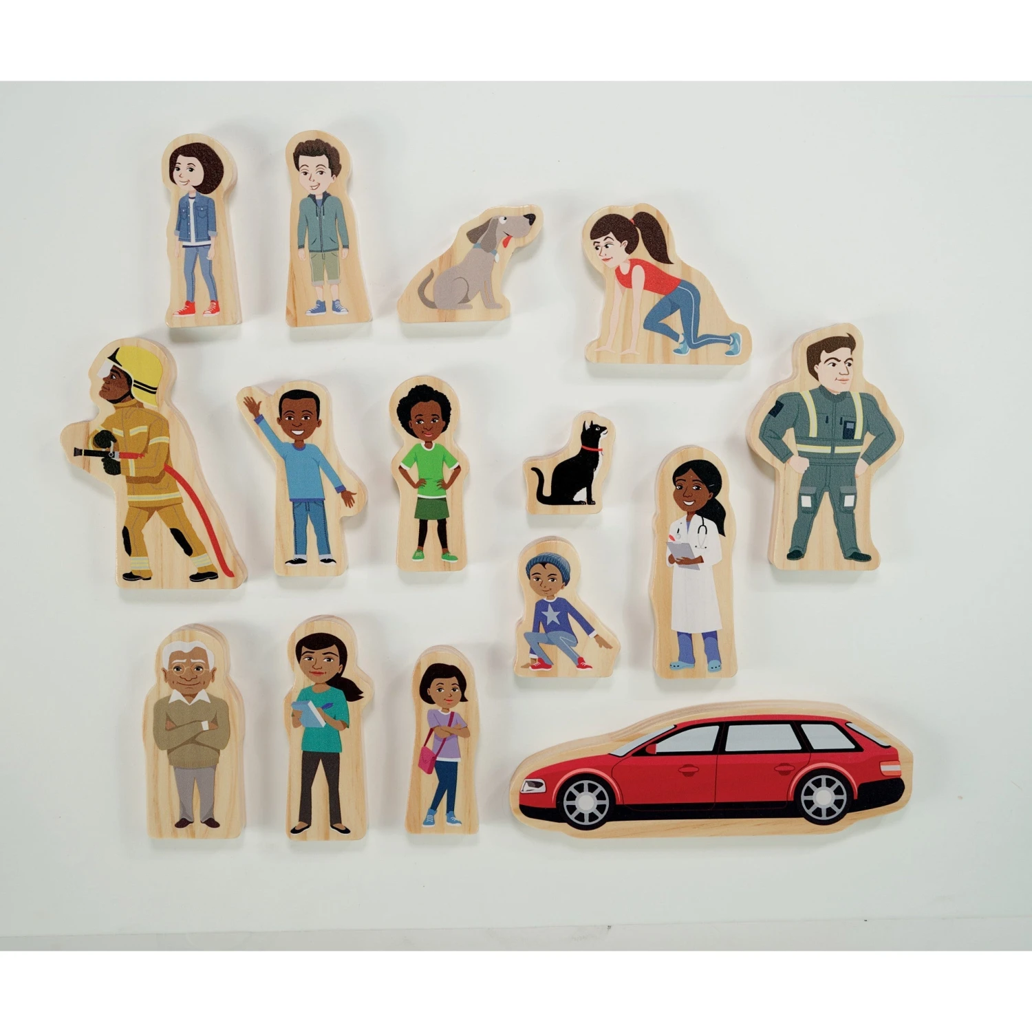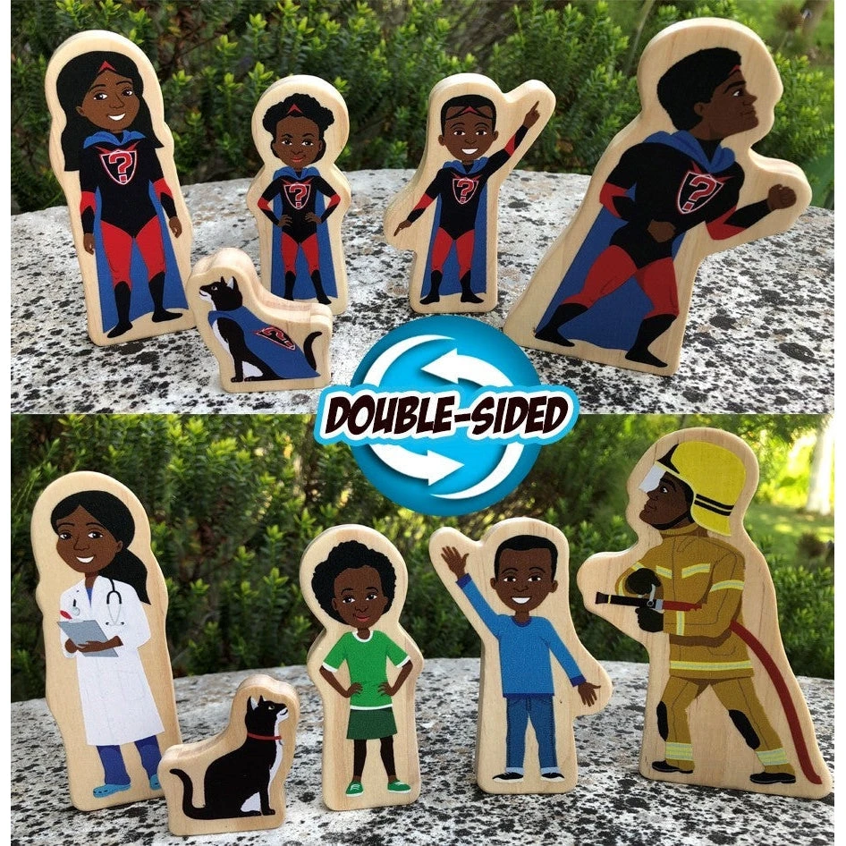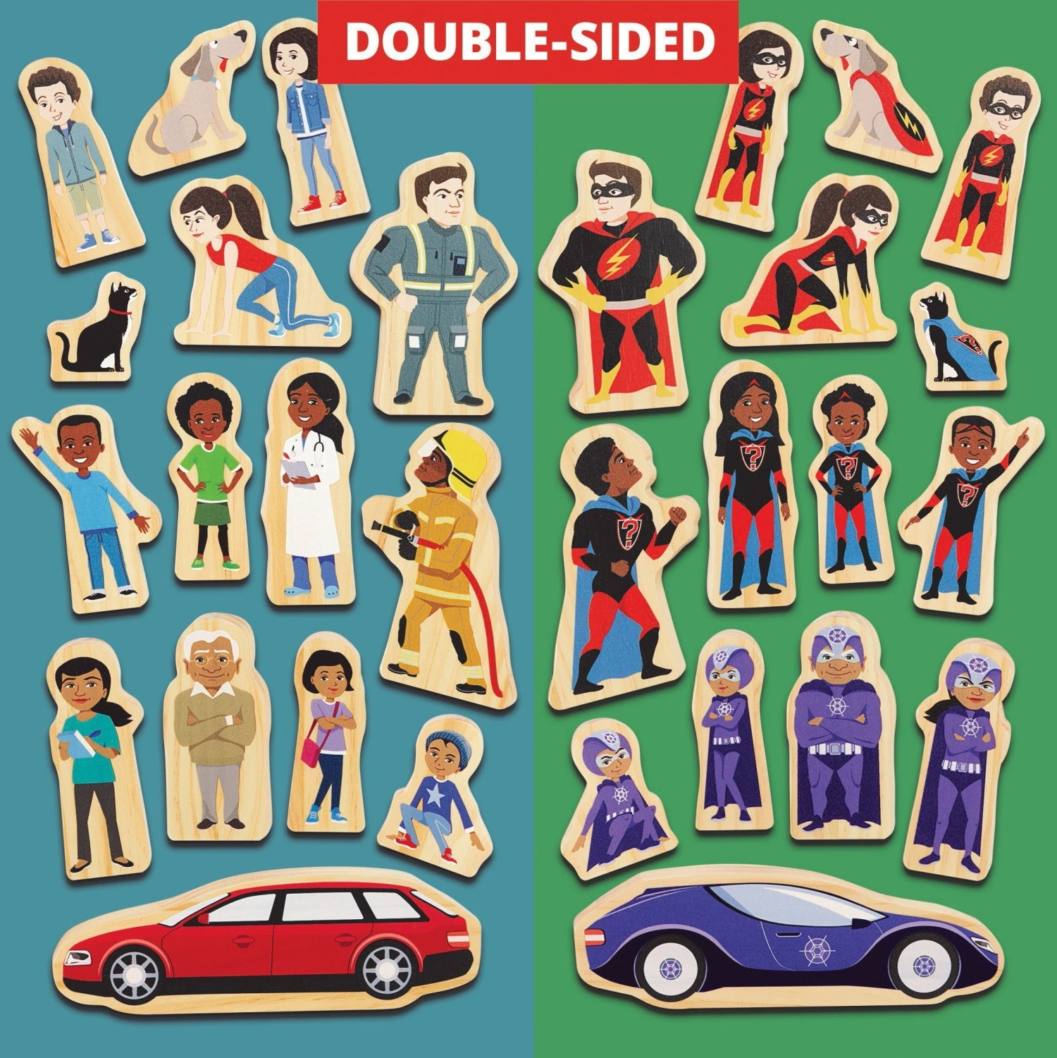 - Contains 15 wooden characters (3 super families!)