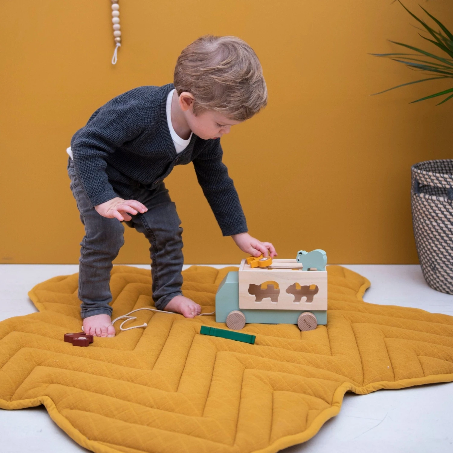Out and about with all the animals! This truck has 5 animal friends on board. You can pull the truck and all the animals along with the string attached to the front. The openings on the side of the truck challenge children to puzzle and enhance their fine motor skills. Slide the top of the truck open in order to easily take all animals out. These different animals are great to invent the wildest adventures with. The truck and all the animals are made of 100% certified wood. All paints on this product are water-based, safe for children and non-toxic.