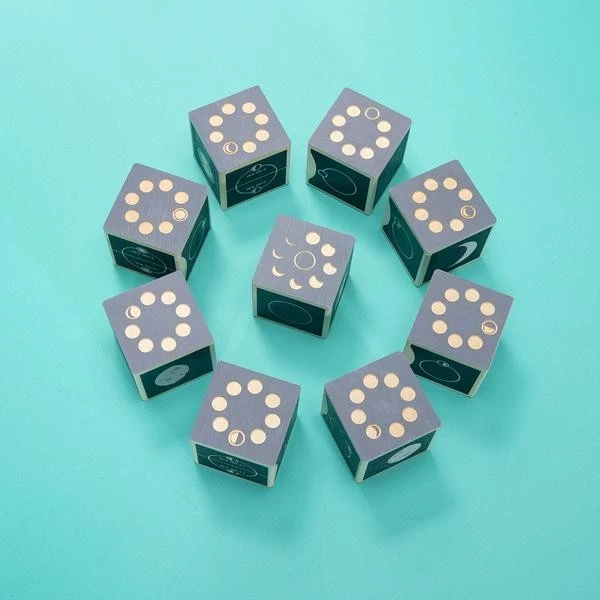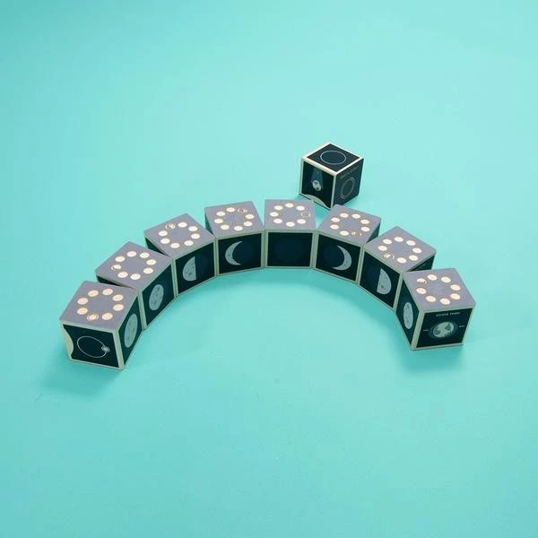 This 9 block set shows each of the 8 moon phases. Two debossed sides feature a moon phase and its cycle location. Four printed sides reveal moon rise & set times, tidal effects, a phase illustration, and the moon’s location in relation to the sun. This set also includes one bonus block devoted to the lunar eclipse.