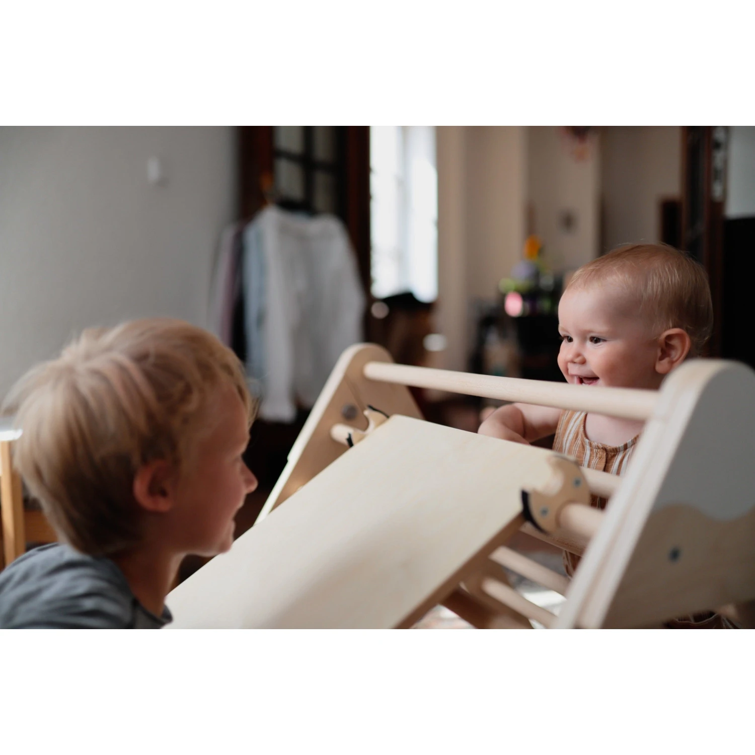 Climbou Desk (available seperately) is a great friend of the Climbou Triangle. Climbou Desk as an inclined plane expands the possibilities of the Climbou Triangle itself. Climbou Desk is a tool that stimulates children’s motor development, helps them learn to concentrate on it and experience a sense of success and confidence in their own abilities. Climbing and crawling itself is a very important task for children. They touch and gradually train their physical coordination and develop gross motor skills in the safe environment of the home. Even the possibility of a safe fall is one of these skills.