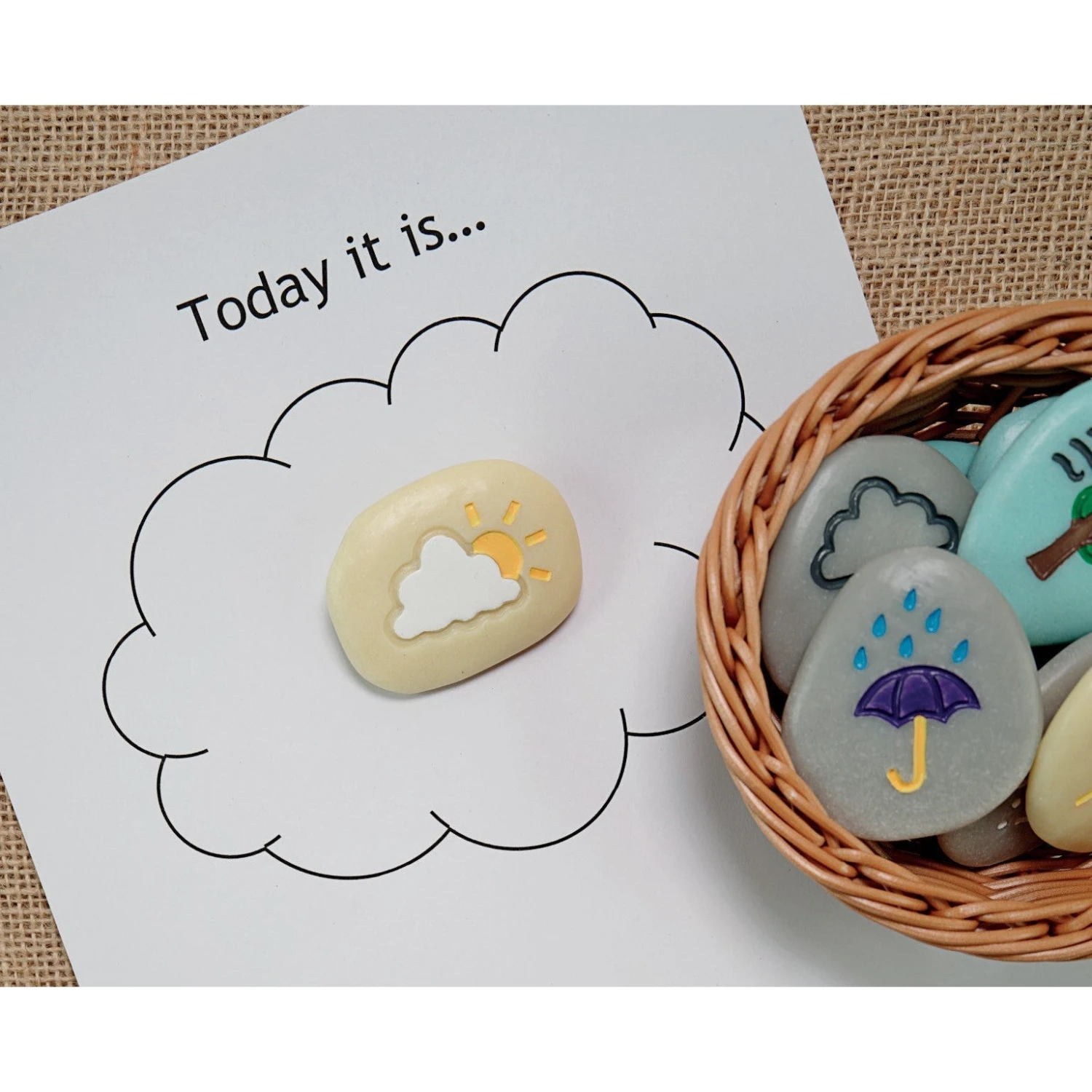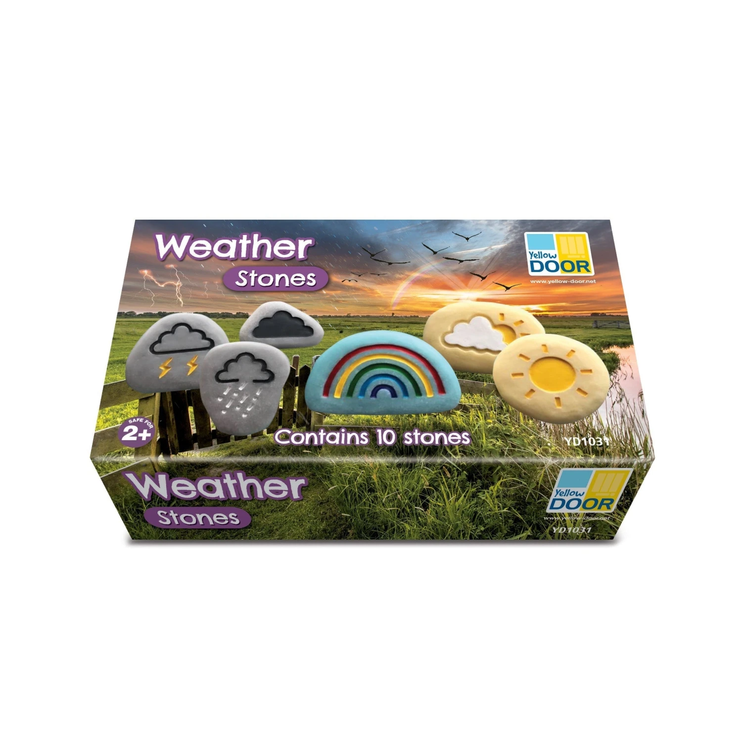 Made from a unique stone mix, the symbols can be used outside, whatever the weather! The set includes ten stones engraved and painted with the following icons: dark cloud, light cloud, hail, rain, rainbow, snow, sun, sunny intervals, thunderstorm, and wind. Each stone measures between 40–55mm high. Safe for age 2+.